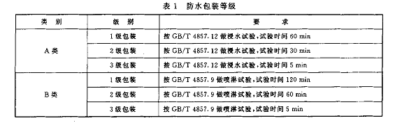 防水包裝等級分為A1級包裝、2級包裝、3級包裝和B1級包裝、2級包裝、3級包裝,詳見表1.